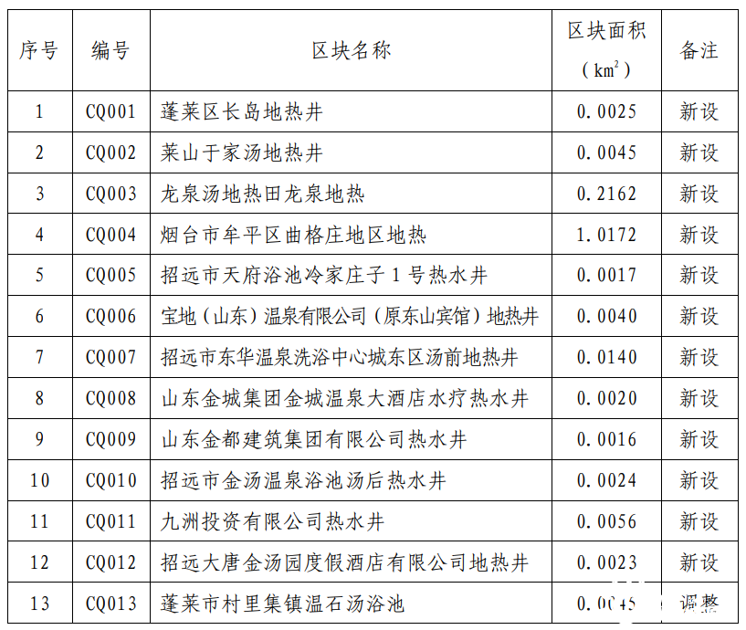 規(guī)劃期內(nèi),共設(shè)置地?zé)峥辈?/a>區(qū)塊2處,分別為山東省棲霞市惠禾·艾山地區(qū)地?zé)?/a>普查和山東省棲霞市長(zhǎng)春湖·霞光地區(qū)地?zé)崞詹?,投放時(shí)間為2022年。規(guī)劃地?zé)嶂攸c(diǎn)開采區(qū)1處,位于招遠(yuǎn)市東湯地?zé)崽?/a>。重點(diǎn)開采區(qū)內(nèi)要嚴(yán)格按照開采規(guī)劃區(qū)塊優(yōu)先投放采礦權(quán),鼓勵(lì)支持礦山企業(yè)整合重組,優(yōu)化開發(fā)布局,提高資源利用效率。
