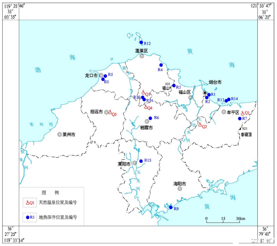 煙臺(tái)市地?zé)崽?/a>多以點(diǎn)狀形式出露在兩組或者多組斷裂交匯帶附近,屬于低溫開放式對(duì)流型帶狀熱儲(chǔ)地?zé)崽?/a>。目前,煙臺(tái)市共有天然溫泉5處、地?zé)?/a>深井15處。煙臺(tái)市已查明地?zé)崃黧w可開采量約650萬(wàn)立方米/年,熱資源量為1.65×10^15焦耳/年,相當(dāng)于標(biāo)準(zhǔn)煤5.62萬(wàn)噸/年。