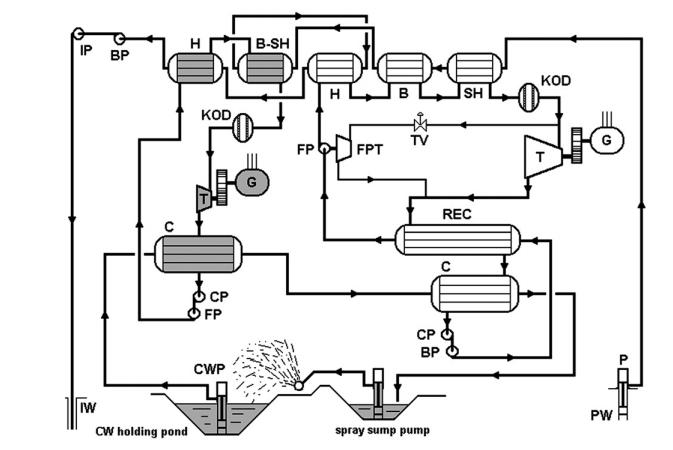 起初的電站使用的就是普通的雙循環(huán)地熱發(fā)電流程的機組。在優(yōu)化了1979年開始使用的發(fā)電機組以后,修整后的地熱電站是一個完全不同的發(fā)電機組。以前的主渦輪機、真回流熱電轉(zhuǎn)換器、和交互蘭金循環(huán)都被還掉了。取而代之的是,一個簡單的,非提取異丁烷渦輪,和九個更大的鹵水熱電交換機。在熱電交換機的管道所在的一邊是鹵水,在殼側(cè)是碳水化合物。驅(qū)動沸騰給水渦輪的異丁烷來自于一個單獨的過熱器的側(cè)流。發(fā)電系統(tǒng)上安裝了一個降壓閥,來降低異丁烷的壓力以適應(yīng)BFPT的注入壓力。換熱器沒有更換,但是現(xiàn)在只是作為一個異丁烷循環(huán)的預熱器。丙烷循環(huán)現(xiàn)在也已經(jīng)獨立于異丁烷循環(huán)。