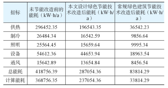 分別使用本文設(shè)計(jì)的被動(dòng)式低能耗綠色建筑節(jié)能技術(shù)和基于專家評(píng)分的常規(guī)綠色節(jié)能技術(shù)改造,改造后能耗對(duì)比結(jié)果如表1所示。