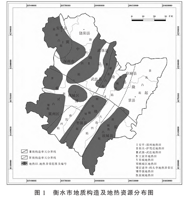 近年來,常規(guī)資源枯竭、全球氣候變暖、霧霾不斷加劇等現(xiàn)象的出現(xiàn),使得能源供給與環(huán)境保護已成為當今社會面臨的主要問題。地熱資源以其資源儲量巨大、分布廣泛、開發(fā)利用穩(wěn)定、安全、清潔、高效和可再生的獨特優(yōu)勢,成為實現(xiàn)能源生產(chǎn)革命、緩解環(huán)境壓力的戰(zhàn)略性資源。衡水區(qū)域地熱資源較豐富,全市新生界平均地溫梯度值3.16℃/100 m,初步查明地熱田及地熱異常區(qū) 9處,分別為:安平-深州地熱田、街關(guān)-護