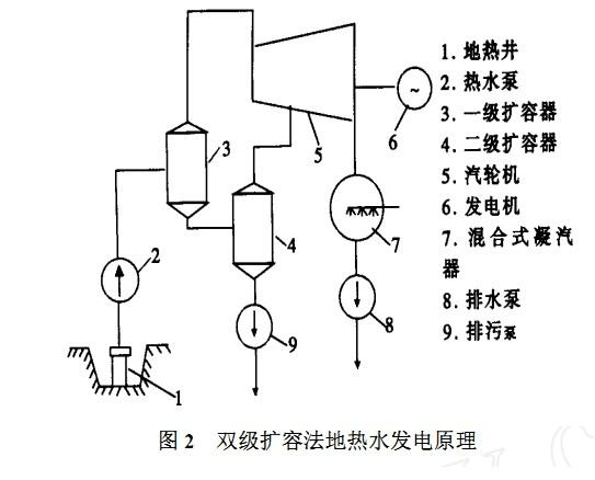 西南電力設計院設計的羊八井地熱電站第1臺試驗機組,容量為1000kW,汽輪機是利用四川內江電廠2500kW廢棄設備改造而成。于1977年10月試運成功,采用單級擴容法熱力系統(tǒng)。若把地熱水送入1個密閉的容器中降壓、擴容,根據水沸點與壓力的關系,可使溫度不太高的地熱水因氣壓降低而沸騰變成蒸汽。由于地熱水降壓蒸發(fā)的速度很快,是一種閃急蒸發(fā)過程;同時,地熱水蒸發(fā)產生蒸汽時,其體積迅速擴大,所以該容器稱為“擴容器”或“閃蒸器”。用這種方法產生蒸汽來發(fā)電稱為擴容法地熱水發(fā)電。這是利用地熱田熱水發(fā)電的主要方式之一,該方式分單級擴容法系統(tǒng)和雙級(或多級)擴容法系統(tǒng)。擴容法系統(tǒng)的原理是:將地熱井來的中溫地熱汽、水混合物,先送到擴容器中進行降壓、擴容(稱閃蒸),使其產生部分蒸汽,蒸汽經過分離器除去雜質(10μm及以上)后,再引到常規(guī)汽輪機機發(fā)電。