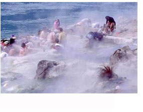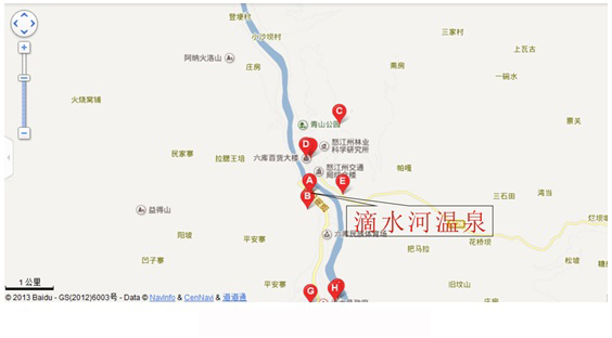 云南滴水河溫泉風(fēng)景滴水河溫泉以泉群形式出露,出水點散布于滴水河河床及河漫灘上,地表為第四系礫石、砂等沖洪積物覆蓋,滴水河溫泉出露特征高程與躍進(jìn)橋溫泉和瑪布河溫泉不同,其出露高程為1502.3m,相對較高。
