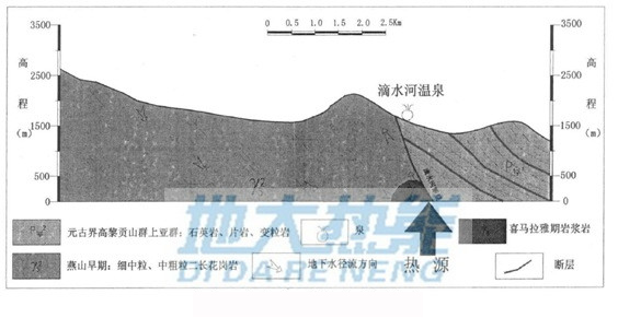 云南滴水河溫泉風(fēng)景出露區(qū)地形地貌特征主要受滴水河河流侵蝕的影響,為河流侵蝕地貌類型,其出露位置主要受滴水河斷層控制。