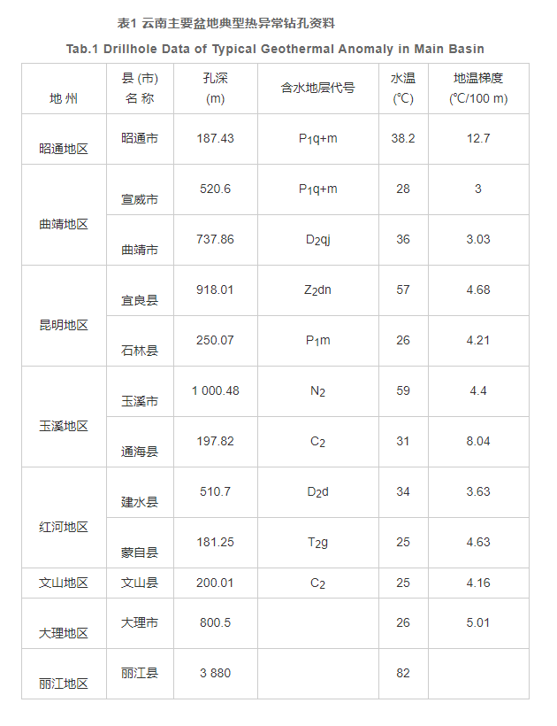 云南中低溫水熱活動(dòng)區(qū), 主要分布在滇東斷陷盆地中, 水溫相對(duì)較低, 但流量大, 共有地?zé)?/a>泉260余處, 地?zé)?/a>鉆孔100多個(gè), 熱泉天然熱流量7.8×104卡/秒, 泉流量4.9米3/秒。以往的勘探成果顯示, 昆明、玉溪、曲靖、昭通、紅河、文山地區(qū)的很多盆地中, 都存在有儲(chǔ)量較大的地?zé)崽?/a> (表1) 。
